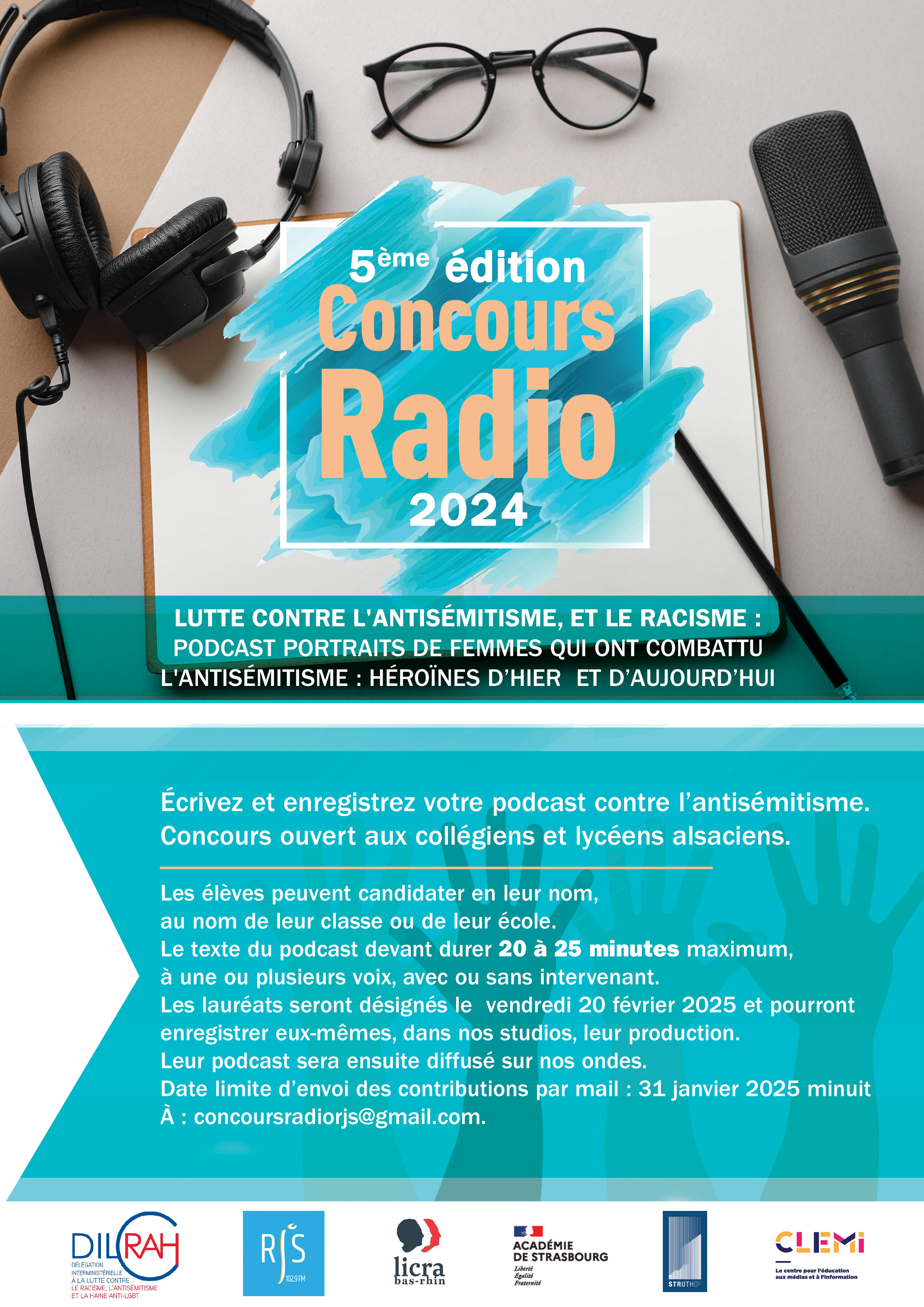 Radio Judaica Strasbourg, en partenariat avec la Dilcrah, la Licra Bas-Rhin, l’académie de Strasbourg, et le Centre Européen du Résistant Déporté, organise la 5éme édition de son concours radio "Lutte contre l'antisémitisme et le racisme : podcasts portraits de femmes qui ont combattu l'antisémitisme : Héroïnes d'hier et d'aujourd'hui". Ce concours s’inscrit dans le plan national de lutte contre le racisme, l'antisémitisme et les discriminations liées à l'origine.