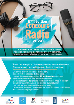 Radio Judaica Strasbourg, en partenariat avec la Dilcrah, la Licra Bas-Rhin, l’académie de Strasbourg, et le Centre Européen du Résistant Déporté, organise la 5éme édition de son concours radio "Lutte contre l'antisémitisme et le racisme : podcasts portraits de femmes qui ont combattu l'antisémitisme : Héroïnes d'hier et d'aujourd'hui". Ce concours s’inscrit dans le plan national de lutte contre le racisme, l'antisémitisme et les discriminations liées à l'origine.