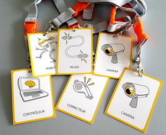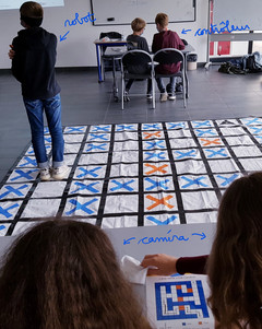 Les élèves ont été répartis en deux équipes concurrentes. Dans chaque équipe, les élèves avaient des rôles différents : caméra, relais, contrôleur, robot, correcteur. Le but était que l'élève-robot arrive le premier au bout du labyrinthe dessiné au sol !