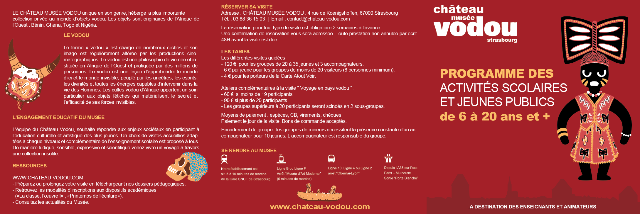 Le Château Vodou propose tout au long de l’année une programmation scientifique et culturelle. Il accueille des conférences ainsi que des expositions temporaires. Depuis janvier 2016, il reçoit les groupes scolaires et les médiateurs proposent différents types de visites. D’ailleurs les collections favorisent une approche transversale, interdisciplinaire : elles peuvent susciter une approche plastique et esthétique et inviter à une réflexion sur le culturel et le fait religieux tout en sensibilisant les jeunes aux autres cultures.