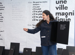 C’est autour du texte Les règles du jeu de Yann Verburgh que les participant·es sont invité·es à vivre cette expérience immersive et collective. Tout commence avec des règles précises : en gris, c’est le ou la comédien·ne qui lit et en noir, c’est le public. Les participant·es entrent dans une salle pour y découvrir un parcours scénographié où l’écrit du texte est omniprésent sur les éléments du décor, les murs ou les accessoires. À tour de rôle, les élèves sont incité·es à lire les répliques de l’histoire de Nama et Oldo aux Pays-des-Guerres, permettant à l’intrigue de prendre vie. En amont ou en aval du spectacle, via un atelier animé par les comédien·nes, les lecteur·ices prennent un temps pour échanger autour de leur rapport à la lecture et aux thématiques soulevées par la pièce. Cette année, La Filature a fait appel à la philosophe Mireille Colin pour aider les comédiens-nes à préparer l’atelier débat.