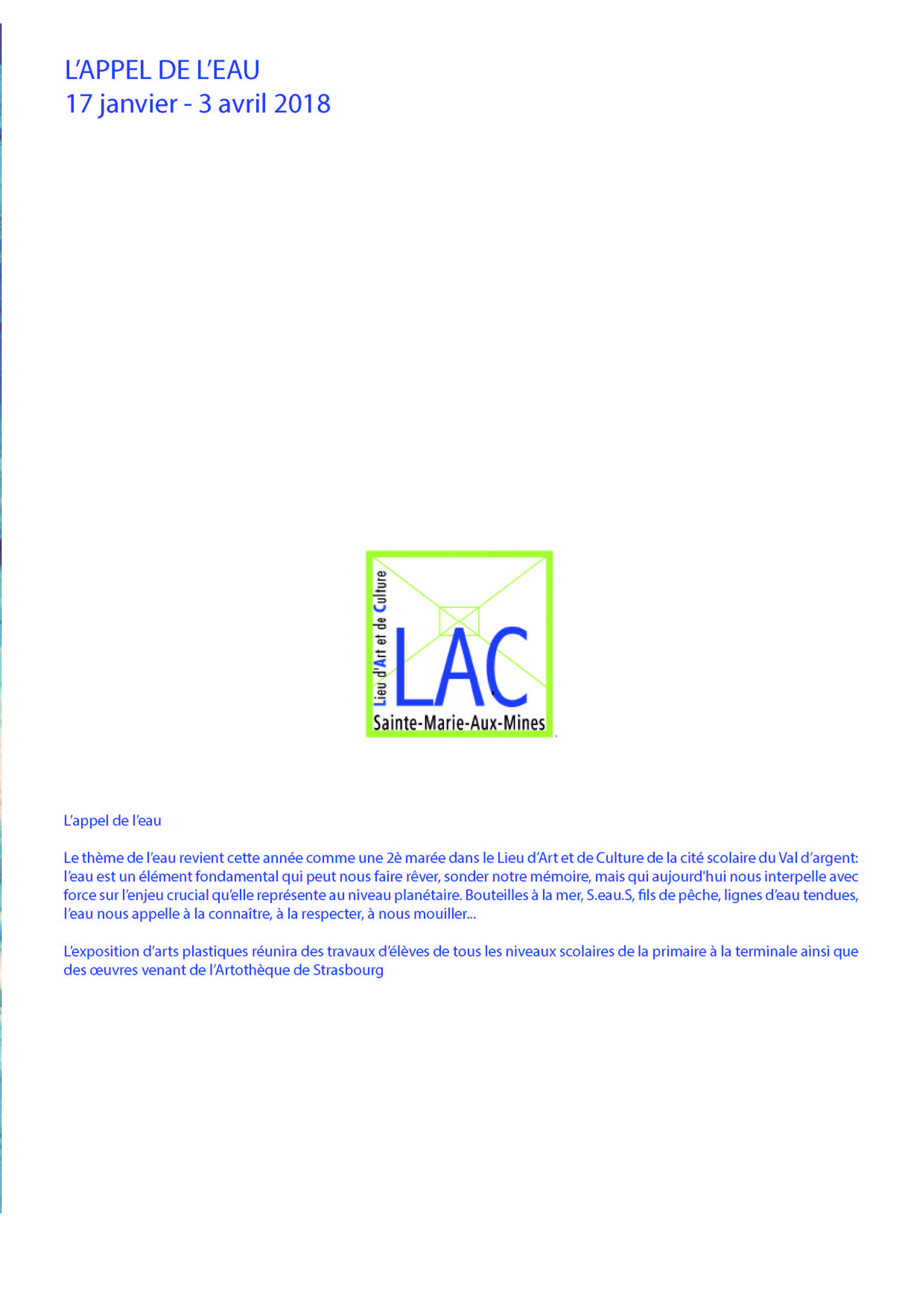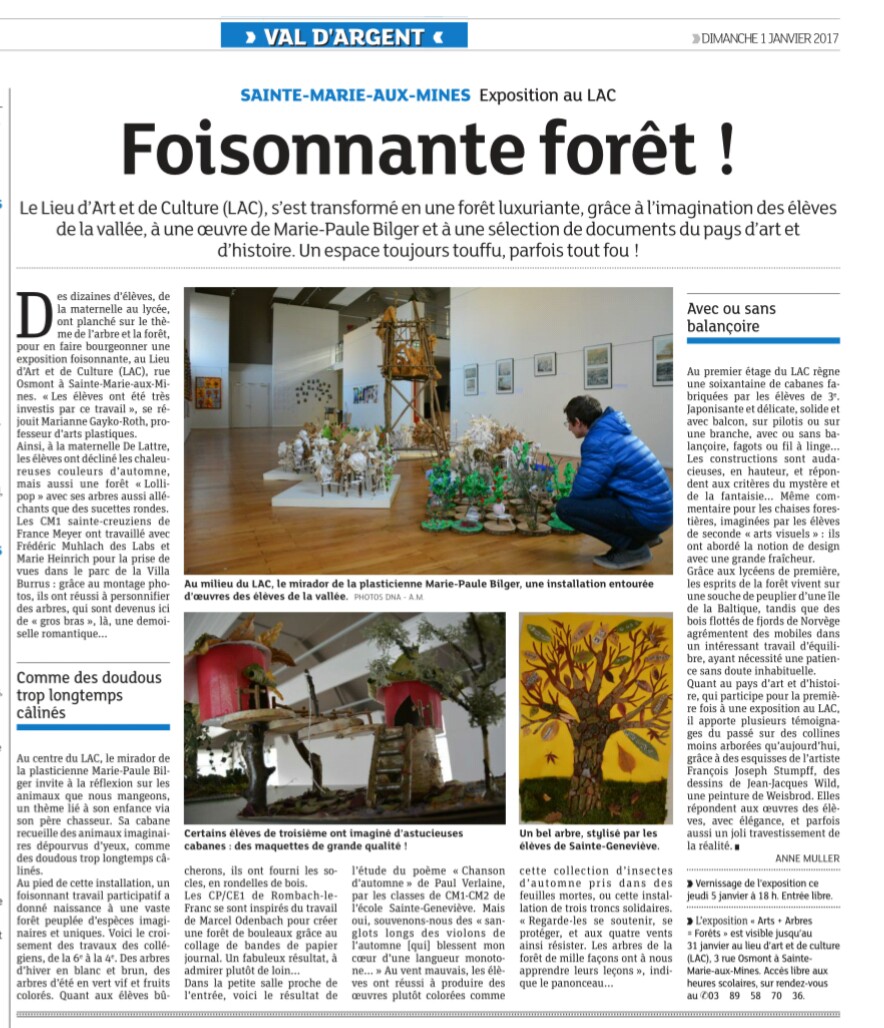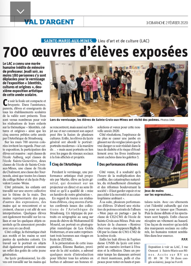 Consulter des photographies pour l'année scolaire 2019 des activités et expositions au LAC de Sainte-Marie- aux-Mines : photo 1, photo 2, photo 3, photo 4 |