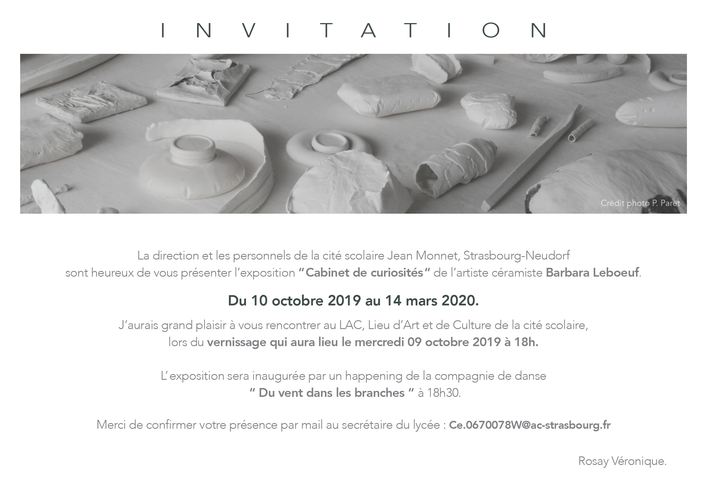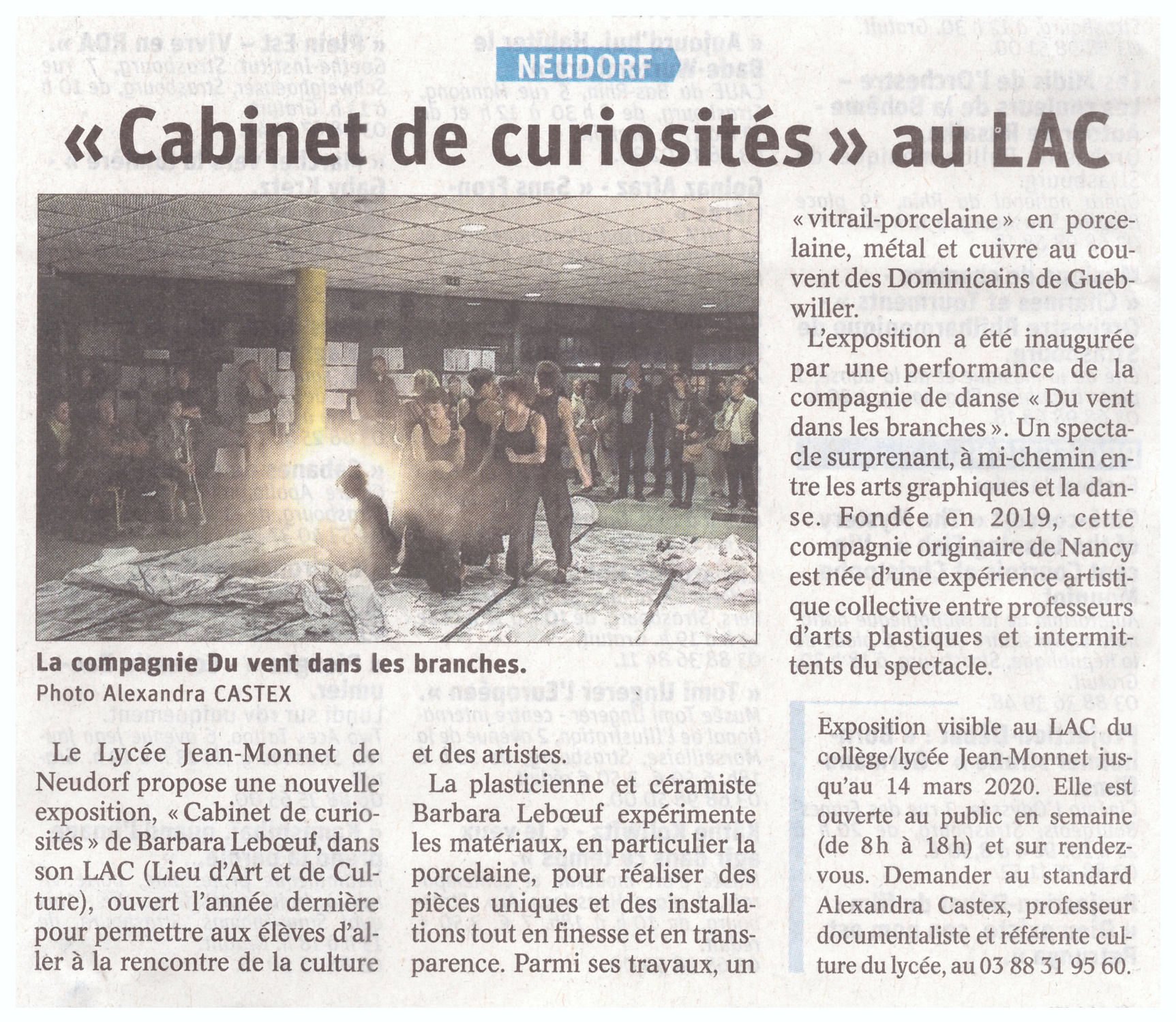 Consulter les visuels pour l'année scolaire 2019-2020 : un article paru dans les DNA, l'affiche de l'exposition, l'invitation au vernissage, les photographies de la compagnie de danse qui était présente lors du vernissage de l'exposition de Barbara Leboeuf, photographie 2, photographie 3, photographie 4