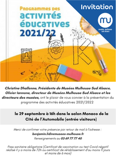 Le service des publics des Musées de Mulhouse Sud Alsace est ravi de vous inviter à sa traditionnelle rencontre de rentrée avec les enseignants qui aura lieu le mercredi 29 septembre 2021 à 16 heures au salon Monaco de la Cité de l'automobile. Après la diffusion d'un film vous présentant les différentes structures et les nouveautés de l'année, un temps d'échange vous sera proposé. Il sera l'occasion de vous inscrire à des ateliers, de découvrir les futures expositions ou de discuter avec les différents partenaires des musées.