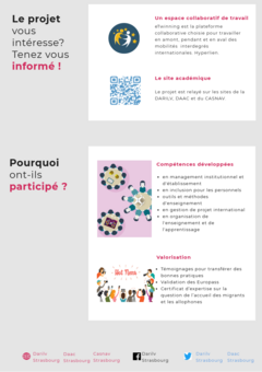 Ce projet permet aux personnels, enseignants et chargés de mission de partir dans 8 pays découvrir les politiques d’accueil des migrants et d'observer les pratiques pédagogiques innovantes pour favoriser la gestion de leur accueil, l'accès à la culture des élèves migrants et allophones et faciliter leur intégration.