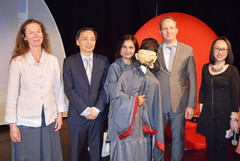 La troupe autrichienne originaire de Vienne est venue présentée le 16 mai trois tableaux sur les voyages de l'amiral chinois Zheng He qui découvrit le Moyen-Orient et l'Afrique. Cette représentation fut également l'occasion pour les personnalités présentes de remettre les trois premiers prix du concours de production artistique sur le voyage de Zheng He. Toutes les productions des élèves sont actuellement exposées à la Direction départementale du Bas-Rhin. Sur la photo, de gauche à droite : Mme Bernard, consule générale d'Autriche, M. He, consul général de Chine, Mme Schäfer, artiste autrichienne, M. Guilbert, délégué aux relations internationales de l'académie de Strasbourg, Mme Zhao, directrice de l'Institut Confucius d'Alsace.