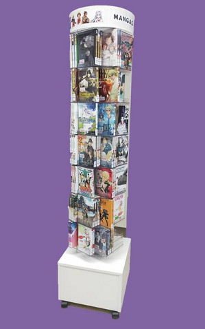 Une possibilité, parmi d'autres, pour mettre en avant les mangas : le tourniquet ! Avec une présentation inversée à la japonaise des livres, ces derniers sont plus visibles et augmentent ainsi leur chance d'être empruntés... Et pour aider les usagers à s'y retrouver au milieu des différentes tours, une double signalitique, écrite et imagée, à créer soi-même en fonction des titres disponibles au CDI.