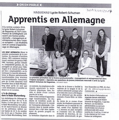 La licence professionnelle "Management et entrepreneuriat dans l'espace européen" est une formation transfrontalière en centre de formation en France. Une partie des cours sont donnés en allemand (niveau . 12 mois de formation, du 1er octobre au 30 sept. Apprentissage dans une entreprise allemande, en application de la législation allemande. Les cours ont lieu les jeudis et vendredis au lycée Schuman de Haguenau et parfois à l’IUT de Schiltigheim.