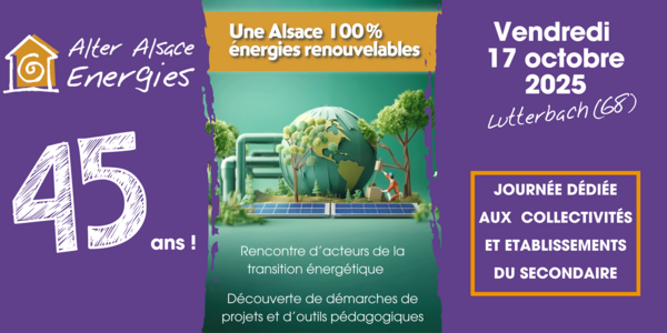 Alter Alsace Energies est une association d’éducation à l’environnement œuvrant pour la maîtrise de l’énergie et la promotion des énergies renouvelables. Issue de l’engagement de citoyens pour des projets d’énergie renouvelable, l’association mobilise aujourd’hui bénévoles et salariés pour sensibiliser et accompagner tous les publics (particuliers, scolaires, collectivités, associations, entreprises) pour réduire leur consommation d’énergie et produire de l’énergie renouvelable. Depuis ses débuts, l’association, en partenariat avec le Rectorat, des professeurs, des collectivités et le réseau ARIENA, élabore des outils pédagogiques pour accompagner les porteurs de projets en lien avec le climat et l’énergie. L’accompagnement porte aussi bien sur la sensibilisation des usagers que sur le suivi des installations techniques.