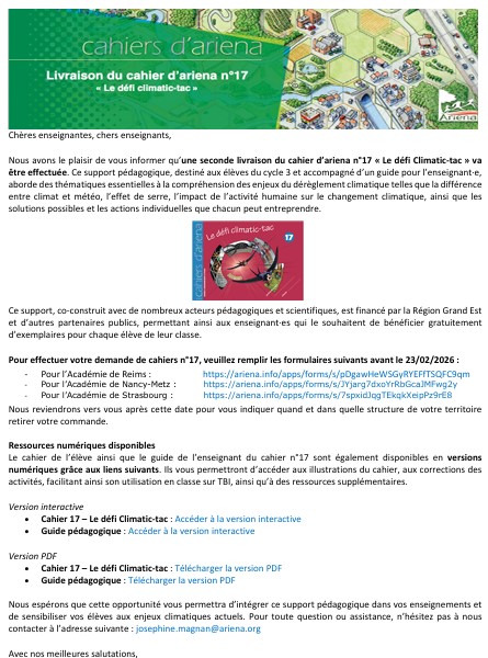 Les cahiers d’ariena sont élaborés et édités depuis plus de 20 ans grâce au partenariat fort entre l’Ariena, les réseaux d’éducation à l’environnement du Grand Est, l’éducation nationale et la région Grand Est. La collection se compose actuellement de 17 ouvrages et un numéro spécial qui abordent des thèmes clés de l’éducation au développement durable comme le sol, la forêt, l’urbanisation, la biodiversité, l’alimentation, les énergies, etc.
