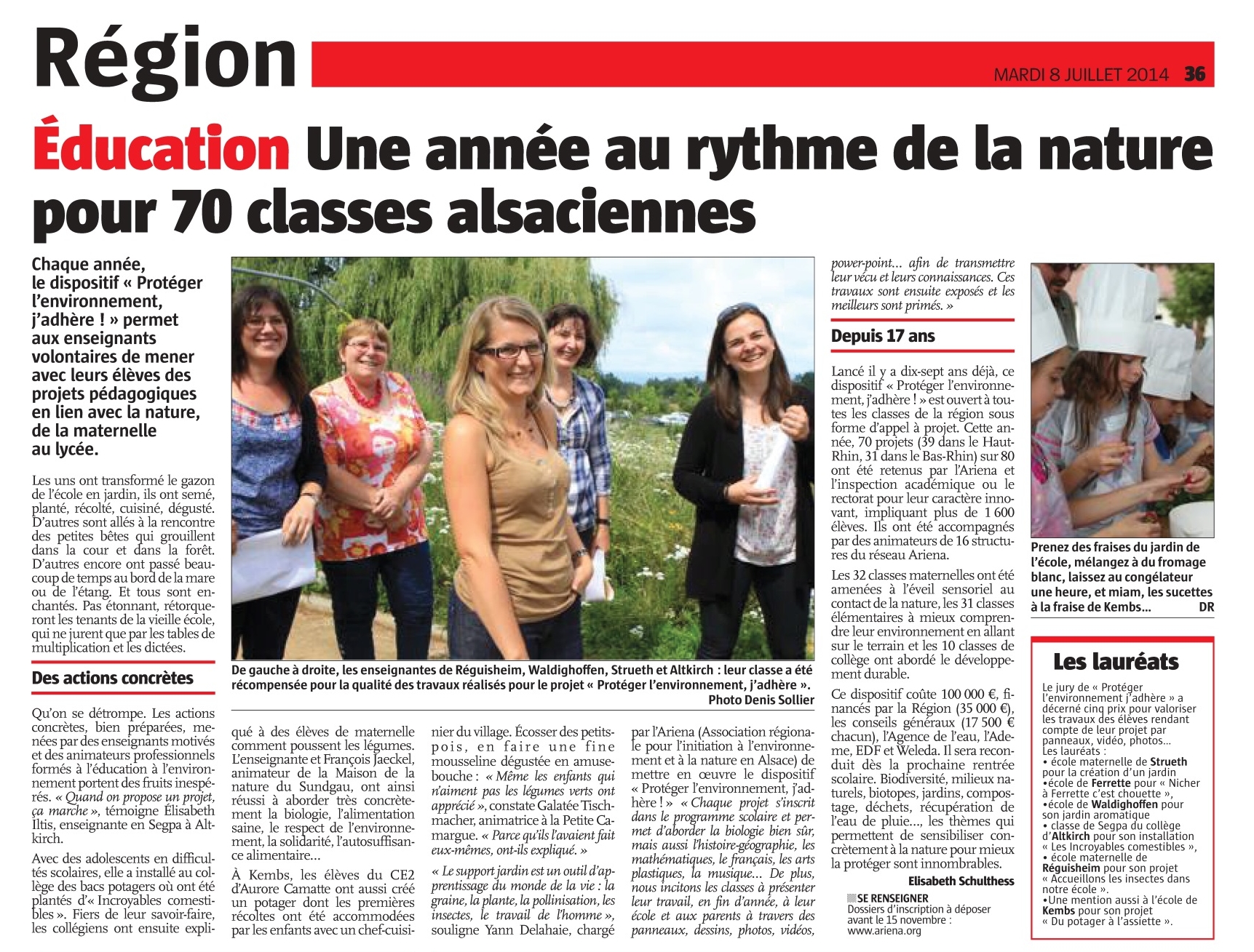 Sur les 111 projets soutenus, de la maternelle au lycée, une trentaine de classes avait exposé leurs réalisations du 20 au 29 juin à l’Hôtel de la région Alsace (Strasbourg). Les membres du jury (représentants des différents partenaires du dispositif : Ariena, région Alsace, conseil général du Bas-Rhin, conseil général du Haut-Rhin, rectorat, Dreal, Ademe, Agence de l’eau Rhin Meuse, EDF, Weleda et la fondation Alcoa) ont désigné 5 lauréats.