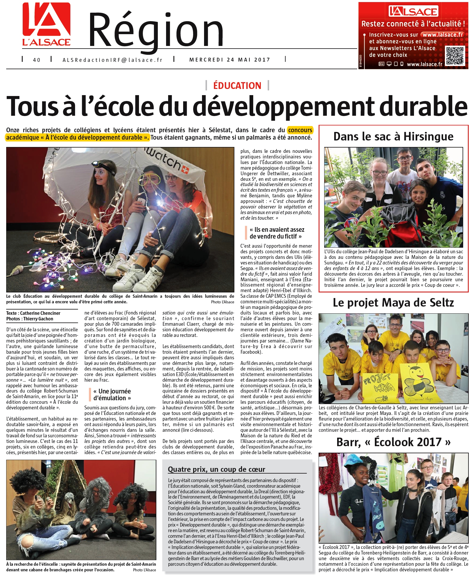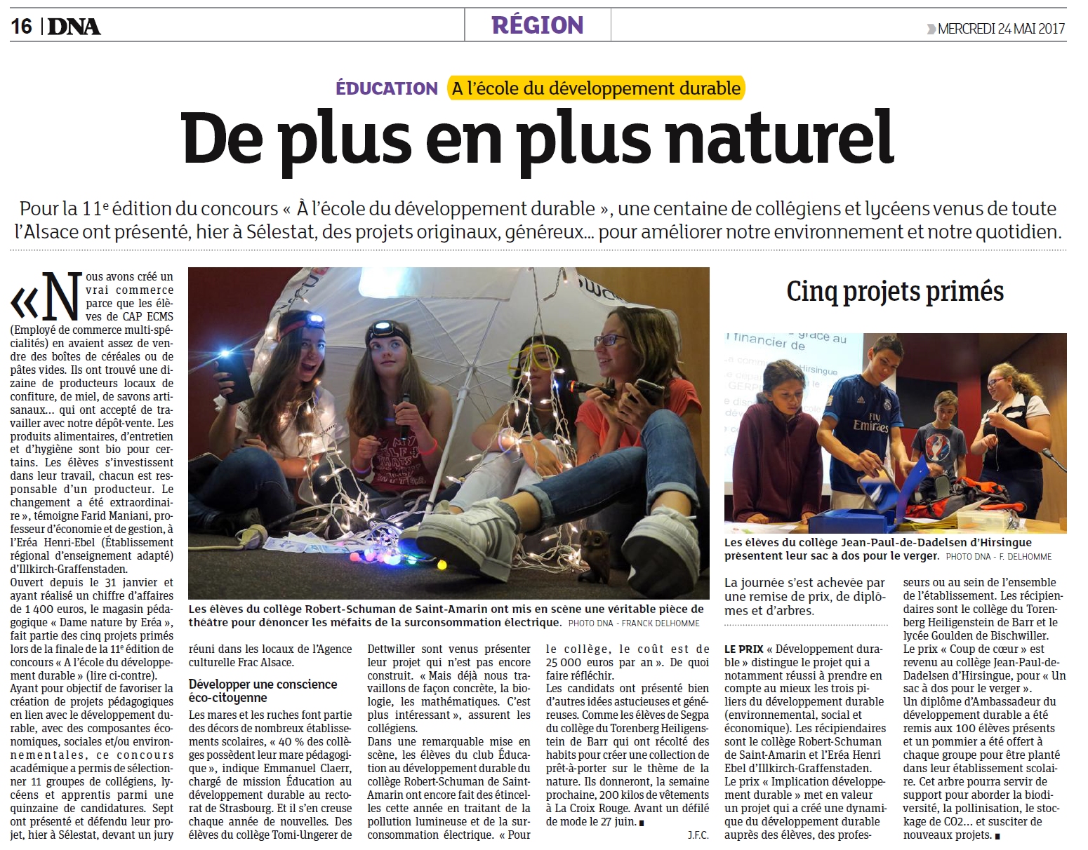 - Collège Robert Schuman de Saint-Amarin (68), en partenariat avec EDF en Alsace pour le projet "La lumière nuit"