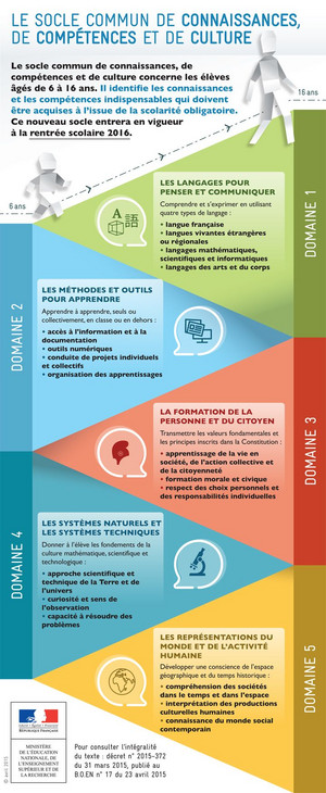 À partir de septembre 2016, le socle communs'articulera en cinq domaines de formation définissant les connaissances et les compétences qui doivent être acquises à l'issue de la scolarité obligatoire :