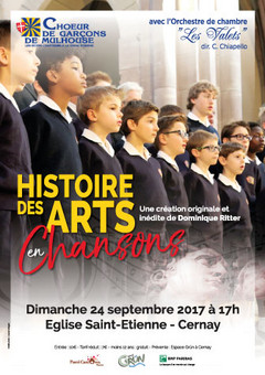 Pour ceux qui n'avaient pas eu l'occasion de découvrir une histoire des arts en chansons, venez suivre ce parcours original dans 2000 ans d'arts et de culture. "Instructive et pédagogique, l'oeuvre convient parfaitement aux scolaires et enfants... mais aussi à tous ceux qui désirent apprendre d'une façon ludique et agréable! Son exploitation scolaire dans des travaux pratiques interdisciplinaires est plus qu'envisageable". Prochaines dates : dimanche 15 octobre 17h église de Remiremont dimanche 19 novembre 16h église de Bennwihr dimanche 14 janvier 2018 16h église St François d'Assise de Mulhouse