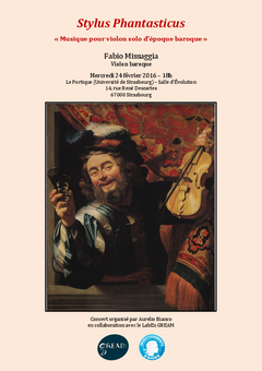 Labex GREAM de l'université de musicologie nous invite à un concert organisé par Aurelio Bianco, directeur du département musique le 24 février à 18h00 à l'Université de Strasbourg. Le violoniste, Fabio Missaggia, explorera les pièces qui révèlent