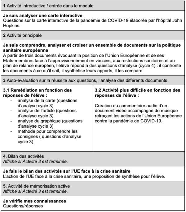 L’activité principale repose sur la compétence d’analyse et de compréhension de trois documents issus du site Touteleurope.eu et surtout pertinents sous leur forme numérique. Les questions portent essentiellement sur des compétences de cycle 4 (confronter plusieurs documents, avoir une vue synthétique de leur contenu, relier les documents à des connaissances préalables) et visent à préparer un développement construit en repérant les atouts et les difficultés de l’UE face à la crise sanitaire.