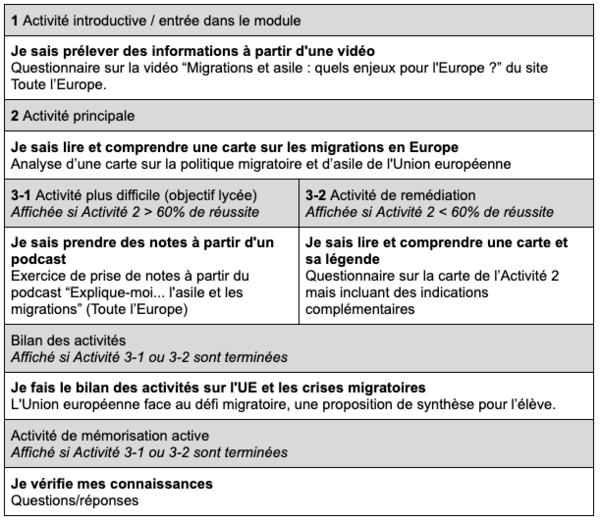 Lorsque les trois activités (1, 2 et 3-1 ou 3-2) sont réalisées, on affiche à l’élève une synthèse écrite, et souhaitons le exhaustive, des principaux éléments à assimiler sur le thème. Une piste d’augmentation pourrait être de proposer cette synthèse dans d’autres formats (son, vidéo, infographie interactive…).