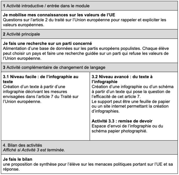 Pour ce module, des connaissances sur les valeurs de l’UE sont nécessaires même si un rappel est prévu. Nous avons volontairement évité le terme “populisme”, difficile à définir, souvent utilisé comme une attaque politique et qui s’applique à des formations/hommes.femmes politiques de gauche et de droite. Nous lui avons préféré une caractérisation plus simple mais aussi plus réduite. Ainsi, les partis eurosceptiques ou anti-européens n’ont pas été ciblé en tant que tels.