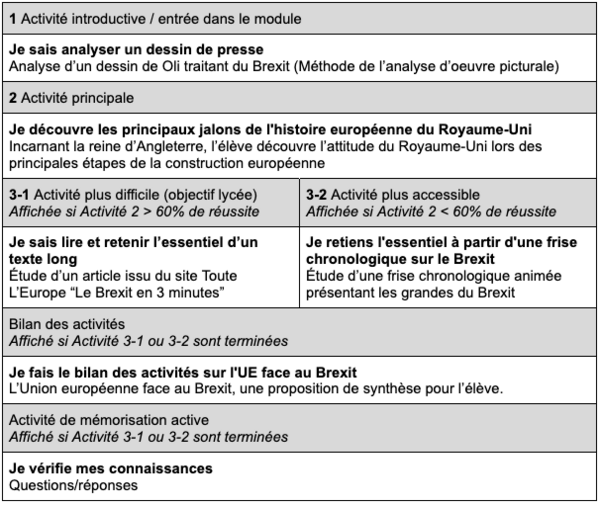 Si l’élève obtient plus de 60% à l’activité 2, l’activité 3-1 lui sera proposée. Un questionnaire alternant les questions de synthèse et les questions plus précises, lui permettra de retirer l’essentiel d’un article entier disponible sur le site Toute l’Europe : Le Brexit en 3 minutes.
