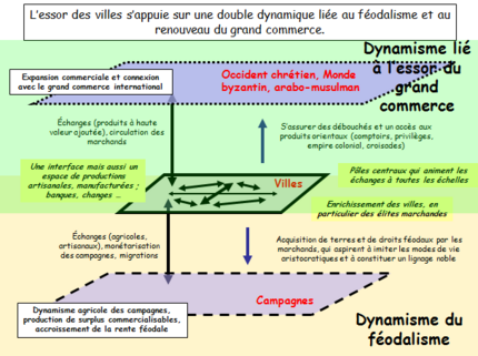 - L’essor des villes s’appuie sur une double dynamique liée au féodalisme et au renouveau du grand commerce