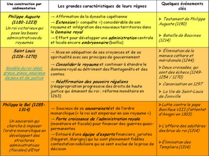 - Le royaume de France comme « étude de cas » (extension du domaine royal, territorialisation du pouvoir des Capétiens, une approche plus biographique autour de trois rois emblématiques du renforcement de la monarchie et de la construction de l’Etat).