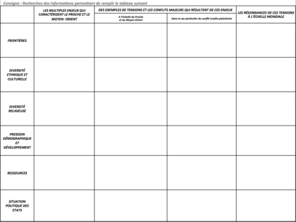 Il s’agit d’aborder les principaux enjeux qui caractérisent le Proche et le Moyen-Orient en illustrant les tensions et les conflits qui en résultent par des exemples à l’échelle de la région et à celle du conflit israélo-palestinien. On en montre les résonnances à l’échelle mondiale. Par ce biais, on peut faire un état des lieux actuels des enjeux et des tensions dans cet espace de tensions, et ce à toutes les échelles.