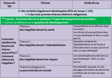 Trois thèmes sur les quatre proposés dans les programmes doivent être traités avec les élèves, sachant que le dernier « La pauvreté dans le monde est obligatoire ». Natasha Jeser, par conséquent, a réfléchi à une progression pour cette 2e partie du programme : elle cherche à montrer aux élèves comment décrire et expliquer l’inégalité de développement des sociétés ? Elle propose d’utiliser le thème 4 sur la pauvreté dans le monde comme une mise en perspective de l’ensemble de la partie.