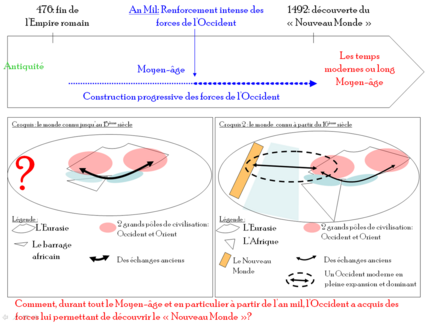 Il s’agit clairement de la transposition dans les programmes de renouvellements épistémologiques et historiographiques assez récents visant à expliquer les origines de la domination de l’Occident sur le monde. Dans son dernier ouvrage, Jérôme Baschet relativise la rupture de 1492 en montrant que la découverte du Nouveau Monde est à la fois le produit de l’accumulation des forces de l’Occident chrétien depuis le XIe siècle et le révélateur de l’émergence de l’Occident comme un des pôles majeurs du monde.
