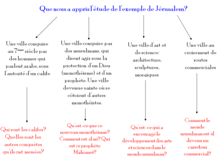 En effet, en partant de l’exemple de Jérusalem, on peut dégager les principales notions et connaissances concernant l’islam mais aussi l’expansion de l’Occident, qui ensuite sont contextualisées dans la même séquence de cours.