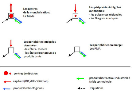 Dans la première partie de son diaporama, Catherine Schmittbiel fait une mise au point assez rapide et synthétique sur la notion de mondialisation, et sur l’organisation du monde qui en découle en centres et périphéries. Elle en déduit une définition opératoire avec des élèves de 4e.
