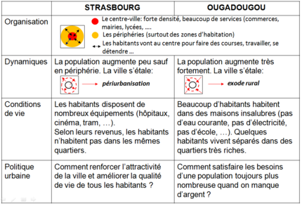 L’étude de cas est ici indispensable pour donner du concret et faciliter la compréhension de ces phénomènes par les élèves. On peut aussi montrer les enjeux différents selon la manière d’Habiter Strasbourg (son centre-ville, ses quartiers périphériques, gérer une ville durablement) ou Ouagadougou (faire face à la croissance démographique et aux conditions de vie difficiles dans un espace en développement).