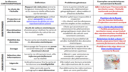 - Interroger le discours produit par le cartographe à partir d’un tableau sériant à la fois les attributs de la carte, les choix du cartographe dans sa construction, les problèmes que cela peut générer. Ces éléments sont à chaque fois illustrés par un exemple portant sur la Russie (le territoire, le peuplement, le fait urbain, l’Etat multinational).