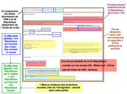 Dans un premier temps, ils procèdent à une analyse de cette relecture des programmes de 3e sur la Ve République, insistant sur les années De Gaulle, Mitterrand et Chirac et cherchant à faire comprendre aux élèves son adaptation sur la durée malgré les crises et les remises en cause.