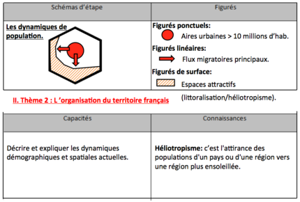 Ils adossent leur proposition sur la programmation réalisée par Catherine Schmittbiel. En effet, ils proposent de faire réaliser aux élèves un schéma élémentaire en conclusion de chaque chapitre. L’objectif est de faire construire par les élèves à la fin de la partie 1 « Habiter la France » un croquis de synthèse avec sa légende regroupant tous les schémas. Ainsi les élèves peuvent travailler différents langages et travailler le passage de la schématisation à la construction d’un croquis organisé et légendé. Les fiches élèves sont intégrées dans le diaporama.