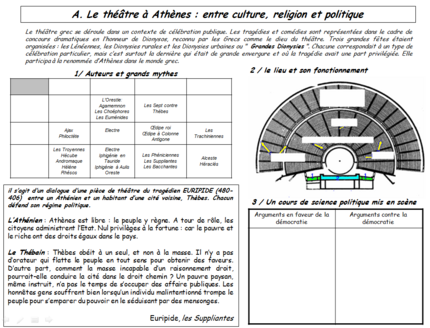 La séquence s’organise en deux temps : le théâtre à Athènes, entre culture, religion et politique puis l’utilisation des mythes pour faire réfléchir les citoyens. Les élèves doivent procéder à des recherches sur internet pour découvrir les différents mythes, auteurs athéniens tragiques, pour travailler un mythe en particulier, celui des Labdacides, qui permet de montrer les morales civiques implicitement portées par ces tragédies.