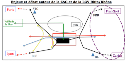 Une étude de cas sur le parvis de la gare de Mulhouse qui montre les enjeux de cet aménagement (autour de la ZAC et de la ligne LGV Rhin-Rhône), aux échelles locales, nationales et européennes, les acteurs qui le financent et les conflits d’usage qui s’en dégagent. Il propose en guise de synthèse un schéma sur les enjeux et débats autour de la ZAC et de la ligne Rhin-Rhône.