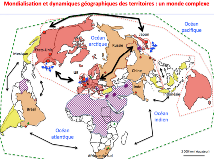 Il fait construire progressivement un croquis de synthèse « Mondialisation et dynamiques géographiques des territoires » : un monde complexe.