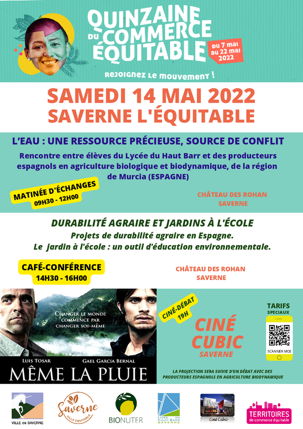 • 10h-12h - Château des Rohan - Saverne “ L’eau : un bien précieux, source de conflit ”. Rencontre entre des élèves du Lycée du Haut-Barr et des producteurs de la région de Murcia. Les lycéens présenteront en espagnol ou en anglais un pays dont la mauvaise gestion de l’eau a entraîné un conflit. Suivra une conférence des producteurs espagnols : “Agriculture biodynamique, pour une consommation raisonnée et raisonnable de l’eau” et un débat entre élèves et producteurs. Gratuit et ouvert à tout public.
