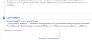 De même que l’enseignant peut commenter les journaux de lecture, les élèves peuvent également laisser un commentaire sur une fiche à partir du moment où celle-ci a été rendue publique.