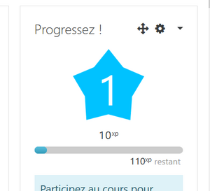 L’élève engrange des points d’expérience en réalisant certaines actions dans le cours. A partir d’un certain niveau de point d’XP (niveau que le prof configure), l’élève change de niveau. Là, il me reste 110 points d’XP à obtenir pour passer au niveau 2.