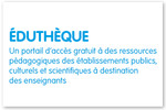 ÉduThèque est un portail d'accès gratuit à des ressources pédagogiques numériques libres de droit des établissements publics, culturels et scientifiques, à destination des enseignants du premier et du second degré. ÉduThèque est un des onze nouveaux services pour faire entrer l'École dans l'ère du numérique.