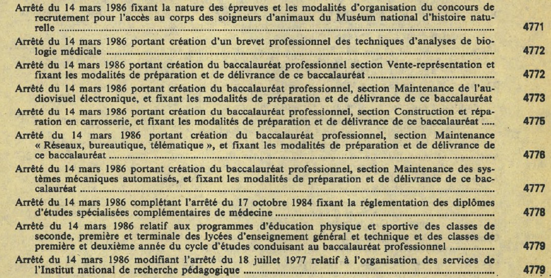 - Décret de création du bac pro (extraits ici) : étudier des passages choisis (JO et décret du 11 mars 1986) permet de montrer l’ambition du projet, la sélection à l’entrée de ses 2 ans, la place des PFMP et/ou l’imbrication du diplôme dans la vie active. Il ne montre pas les blocages des poursuites d’études qui n’ont été levés qu’en 2008 : ce « baccalauréat » visait une insertion rapide, notamment dans les PME.