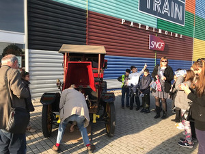 C’est une classe de CM2 de l’école Koechlin de Mulhouse et leur professeur, madame Niglis, qui ont pu profiter en avant-première de la visite du parcours. Après les mots d’accueil des réservistes et des représentants de l’ONAC-VG évoquant la devoir de mémoire et la nécessaire transmission de celle-ci aux jeunes générations, ils ont ainsi pu découvrir la locomotive B8 py 135 qui a servi à transporter les Poilus sur les différents champs de bataille. C’est cette locomotive que l’on peut admirer sur le tableau gigantesque- près de 60m²- Le Départ des poilus, août 1914 du peintre américain, Albert Herter, installé dans le hall Alsace de la Gare de l’Est à Paris. Mais ce qui a le plus ravi les élèves tout autant que l’ensemble des adultes présents c’est un authentique taxi de la Marne, amené depuis le musée de l’automobile et installé pour l’occasion devant la Cité du train. D’autant plus qu’ils ont eu le privilège de pouvoir faire un tour et d’en découvrir toutes les subtilités.
