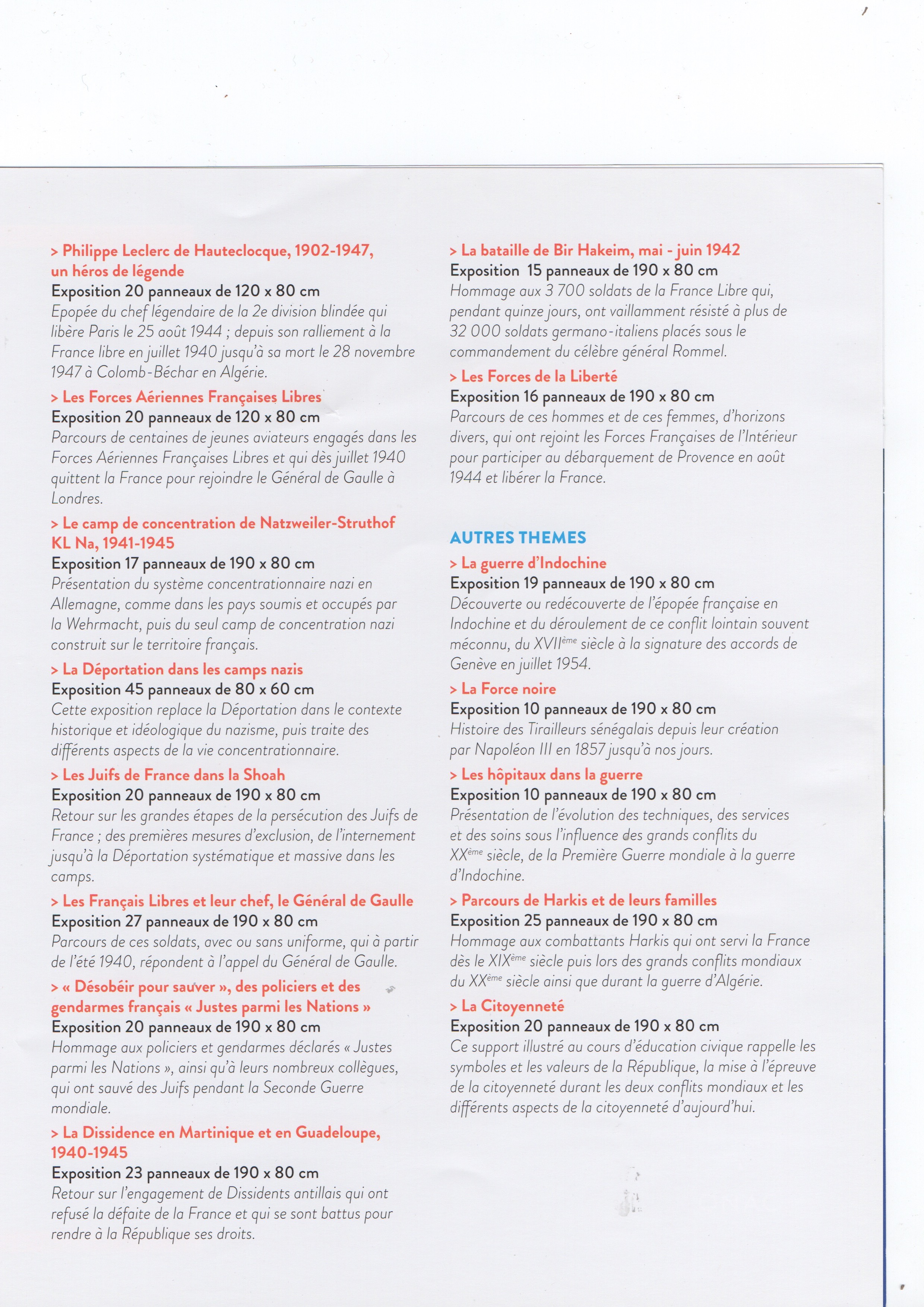 L'Office National des Anciens combattants et des Victimes de Guerre dispose d'une liste d'expositions que vous pouvez réserver et retirer au service départemental de l'ONACVG. On trouve entre autre des expositions sur la déportation dans les camps nazis, sur les juifs de France dans la Shoah , sur les Français Libres, sur les Harkis etc.....