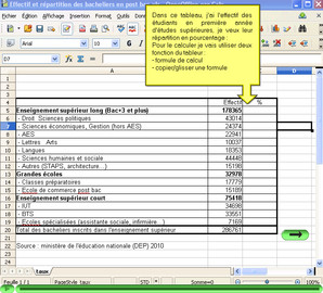 Cette activité permet aux élèves de se former à l’utilisation du tableur Open Office CALC (formule de calcul, automatisation, assistant graphique) et montrent aux élèves que la poursuite d’étude est influencée par le milieu social. Les élèves se forment en utilisant un tutoriel animé puis à partir d’un fichier xls de données vont construire des graphes qu’ils commenteront dans un traitement de texte.