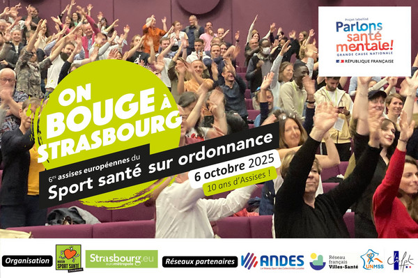 Le 6 octobre 2025, aura lieu la 6ème édition des Assises européennes du sport santé sur ordonnance à Strasbourg, organisée conjointement par le GIP Maison Sport Santé de Strasbourg, la Ville de Strasbourg, le groupe de travail sport-santé du réseau français des villes santé de l’OMS, l’ANDES et l’UNMSS. Cette journée de rencontres est ouverte à l’ensemble des acteurs du sport-santé : professionnels, bénéficiaires, chercheurs, agents territoriaux, étudiants … Elle a ainsi pour vocation de questionner, explorer et promouvoir le sport-santé en France, en Europe et à l’international.
